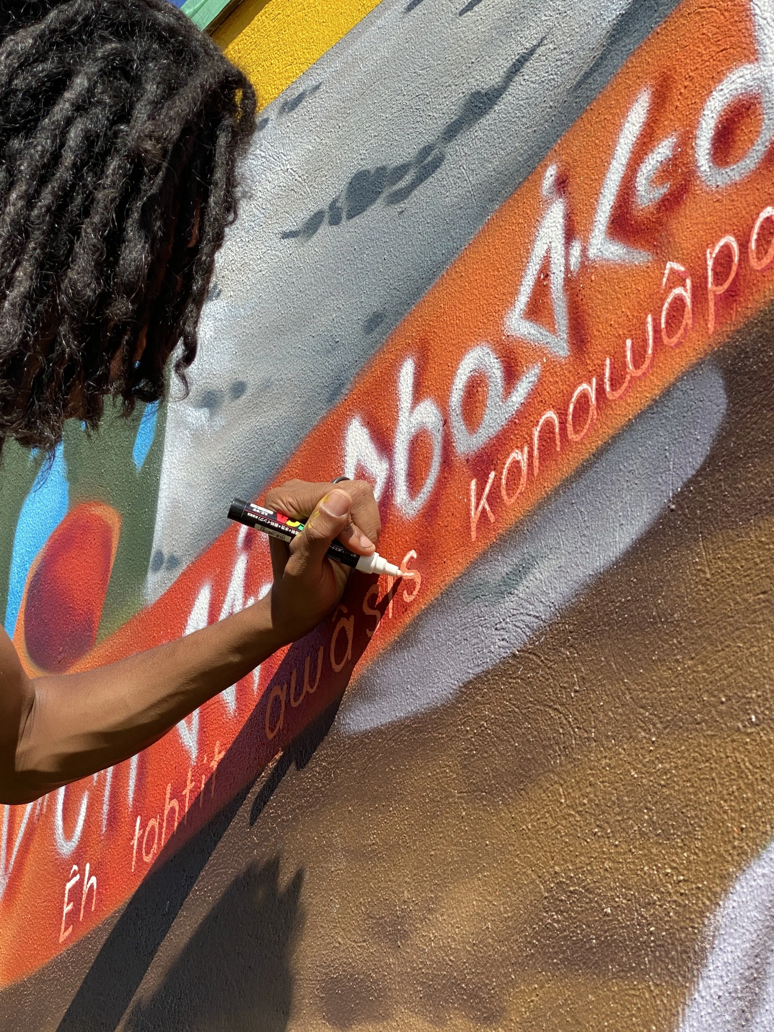 This mural is called ‘Garden for Imaginations’. The process behind this mural involved connecting with the students through in-person visits and conversations, then translating their requests and inspiration into a large mural on the side of the school. Big thanks to Jesse and family for all of the help, and to Elders Jerry and Jo-Ann Saddleback for the guidance and for sharing the Nehiyawak syllabics that appear in the mural.